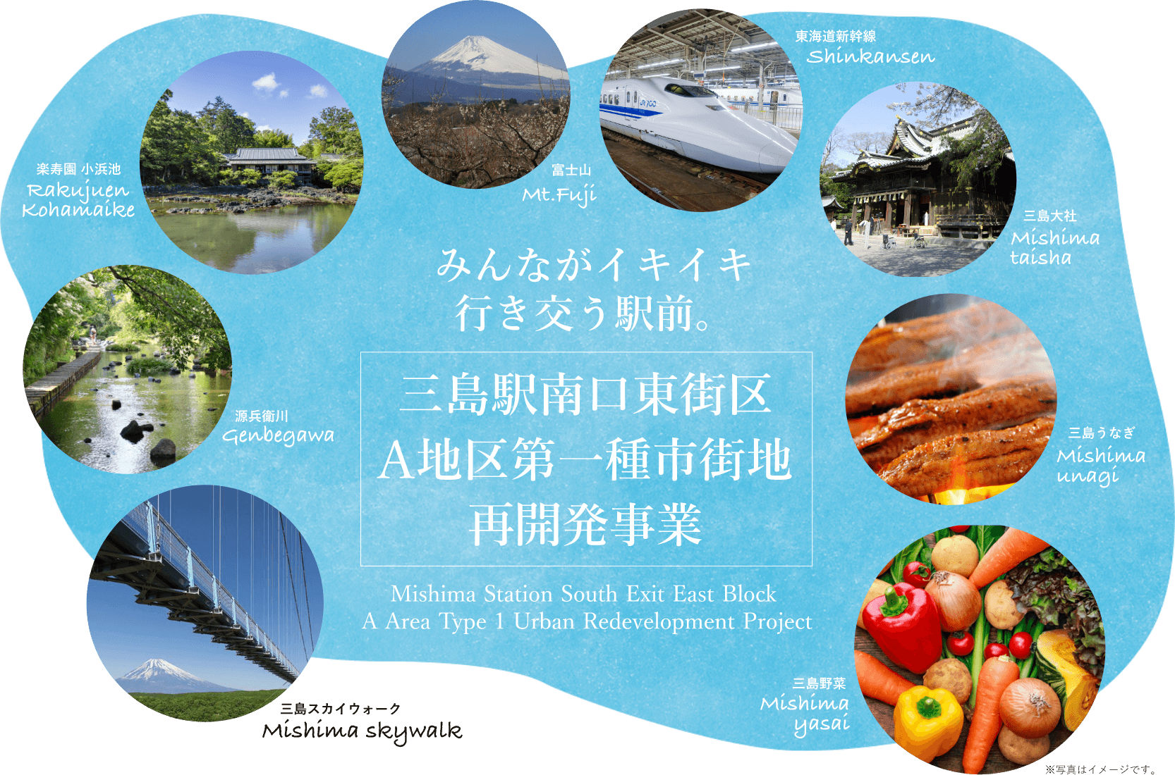 本事業では、三島市の宝である地下水や湧水を守りつつ、伊豆や箱根の玄関口である三島駅前をみんながイキイキ行き交う広域健康医療拠点の整備を通じて、にぎわいや交流を創出し、地域の発展に貢献する再開発事業を目指しております。